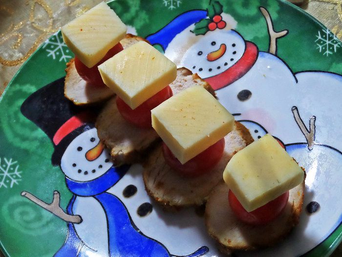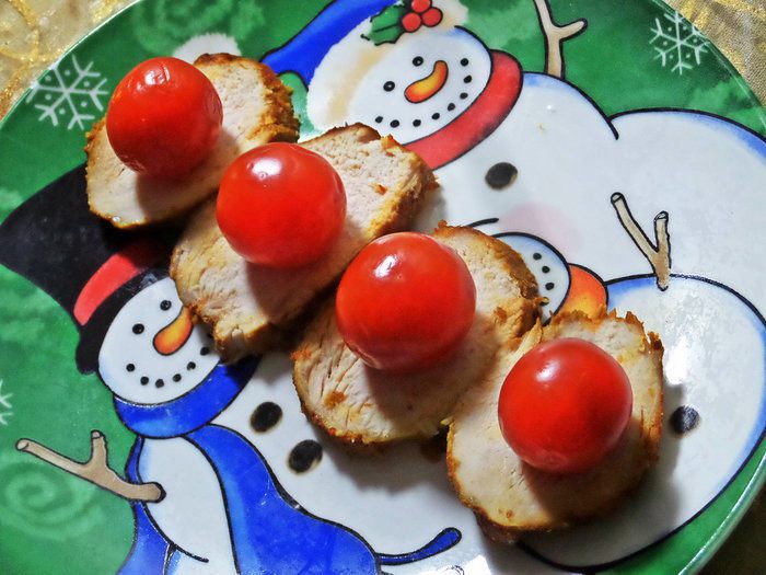 Теперь покажу подачу на шпажках. На ломтик курицы поставить помидорку черри.