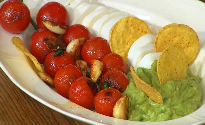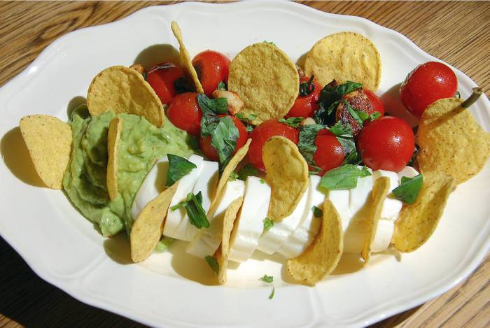 На блюдо выложить моцареллу, обжаренные помидоры с чесноком, гуакамоле и кукурузные чипсы.