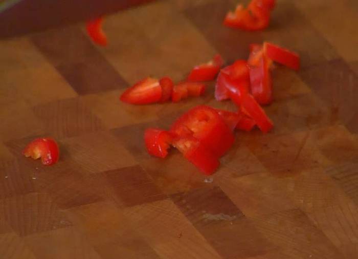 Половинку перца чили мелко порезать.