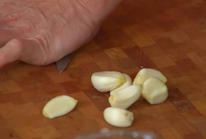Чеснок почистить и раздавить плоской стороной ножа.