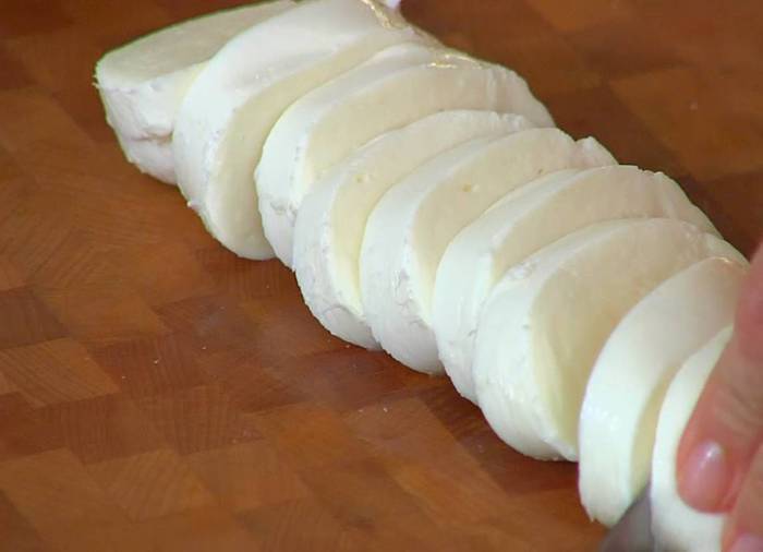 Моцареллу нарезать кружками.
