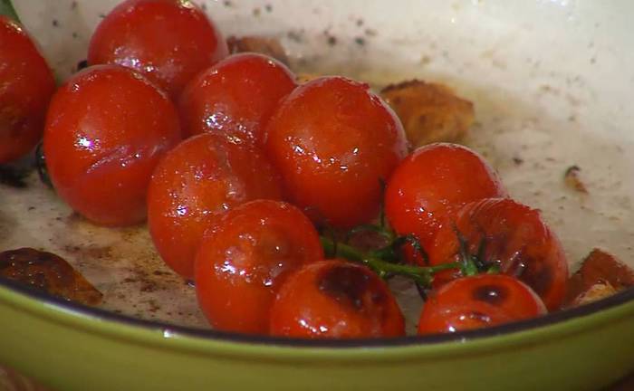 Разогреть в сковороде оливковое масло, выложить чеснок, помидоры на ветке, все посолить и обжарить.