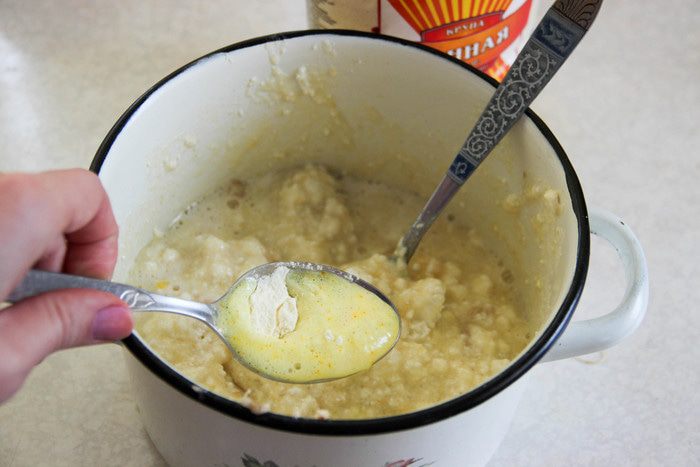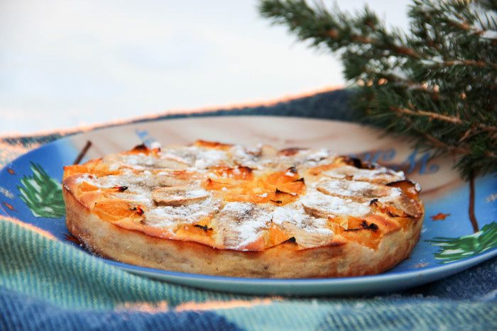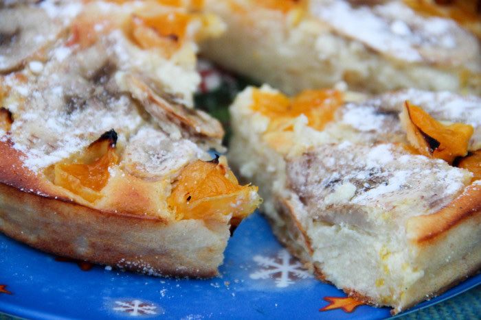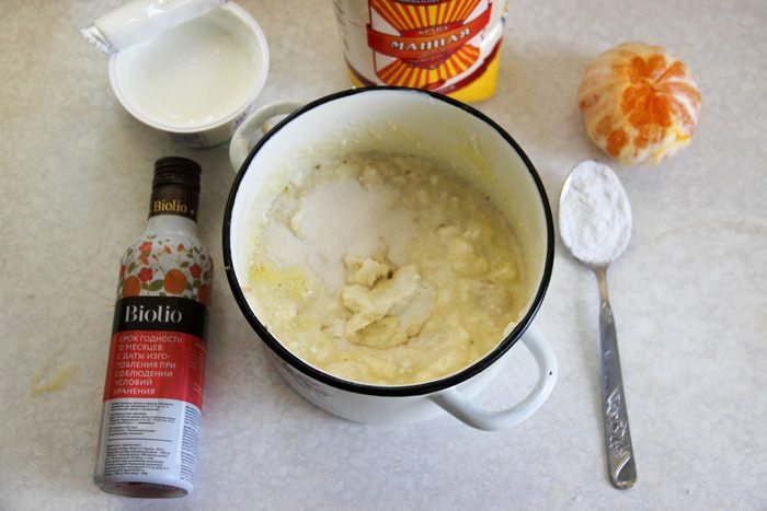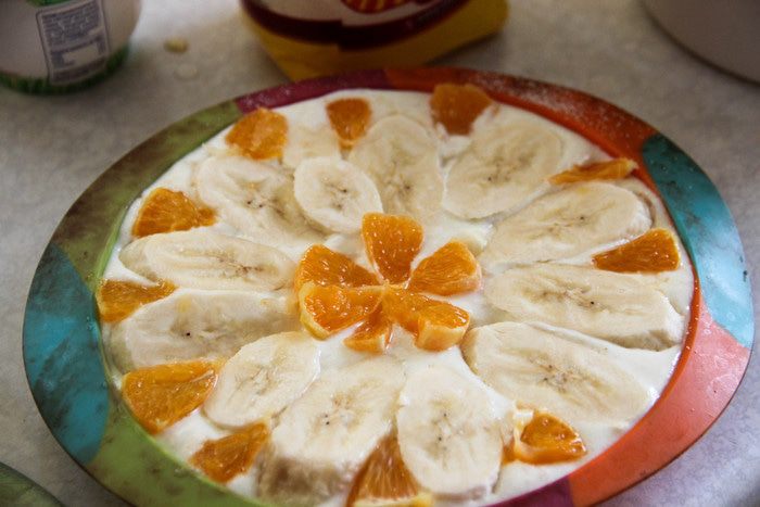 Форму для выпечки смазываем растительным маслом, присыпаем манкой. Выливаем творожно-банановую массу. Сверху раскладываем кружочки банана и нарезанные произвольно кусочки апельсина. Слегка притапливаем фрукты в смеси. Выпекаем при температуре 180°С минут 40.