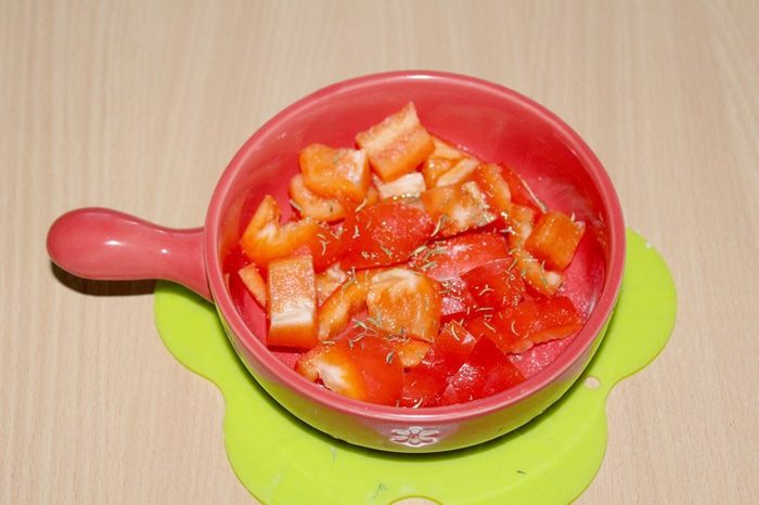 Перец порежьте на кусочки, полейте оливковым маслом, посолите и поперчите, добавьте измельченный тимьян и запекайте в духовке при 220°С примерно 15 минут.