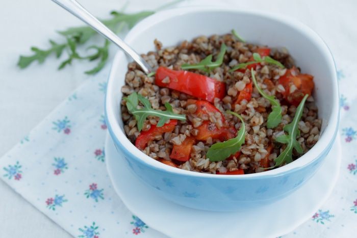 За 5 минут до конца запекания выложите перец на гречку и запекайте дальше.