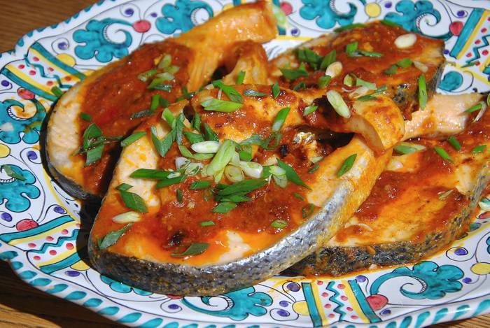 Рыбу с соусом выложить на блюдо и посыпать зеленым луком.