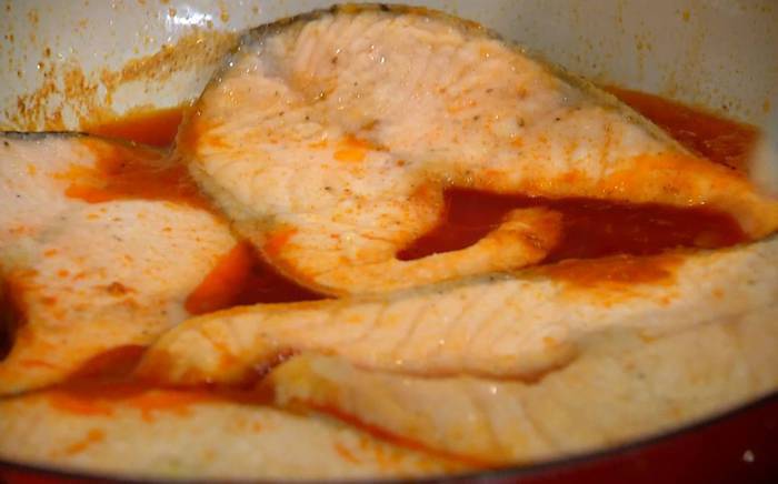 Стейки семги обвалять со всех сторон в муке, выложить в сковороду со специями, накрыть крышкой и готовить 10 минут.