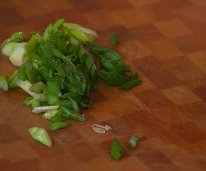 Зеленый лук тонко нарезать наискосок.
