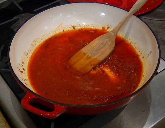 Разогреть в тяжелой сковороде оливковое масло, добавить томатную пасту и растертые специи, все перемешать и прогревать на маленьком огне несколько секунд, затем влить 50‒60 мл воды, увеличить огонь, все перемешать и еще немного прогреть.