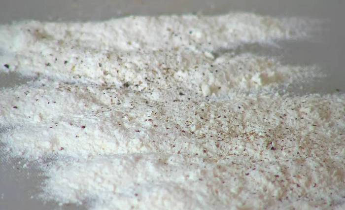 Муку насыпать на рабочую поверхность, посолить и поперчить.