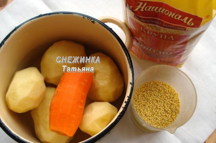Подготовить овощи. Почистить картофель, морковь. Порезать крупными кусочками и поставить варить до готовности. Отмерять количество пшена. Отварить пшено в подсоленной воде согласно инструкции на упаковке ТМ «Националь», из расчета 2 порции воды на 1 порцию крупы.