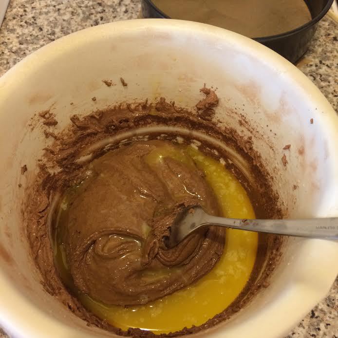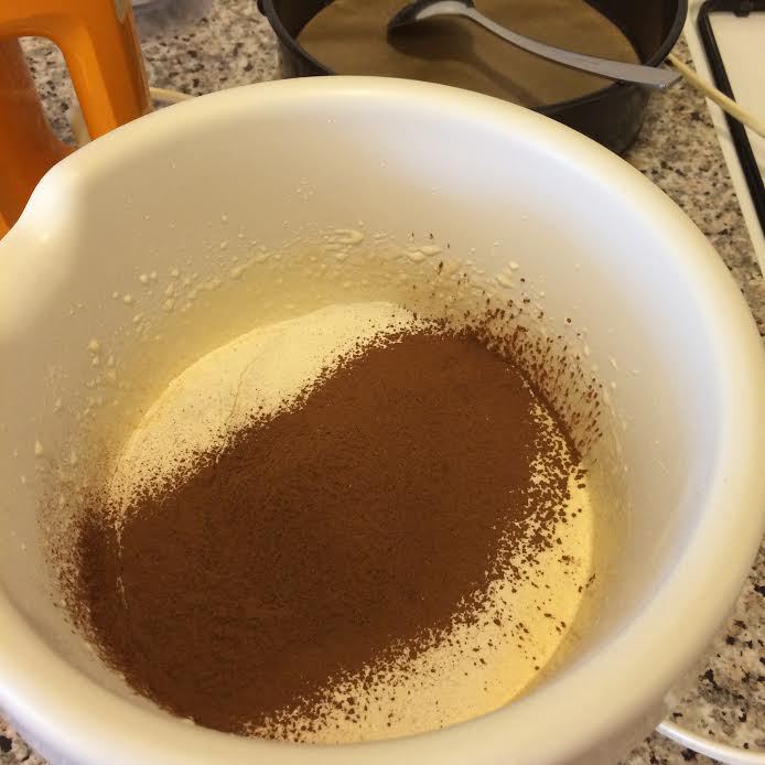 Просеять муку, какао, разрыхлитель и перемешать.