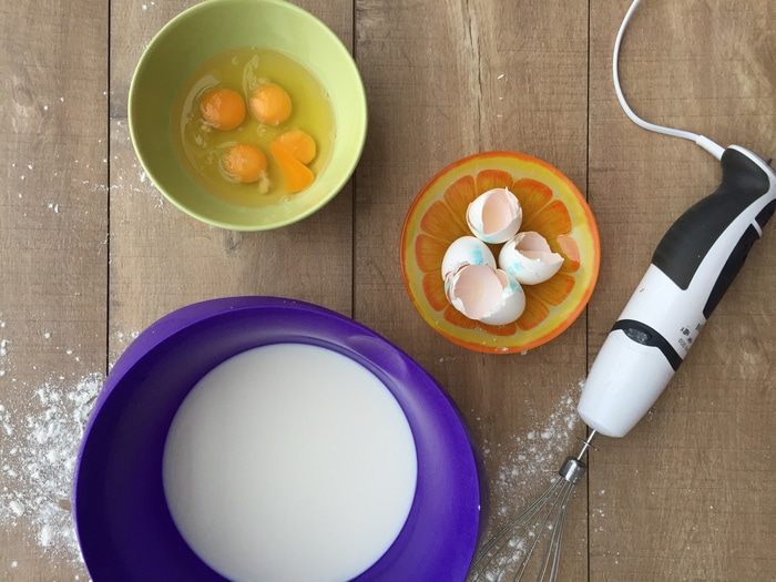 В большой миске на низкой скорости венчиком блендера взбиваем молоко «Домик в деревне» и яйца.