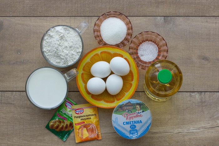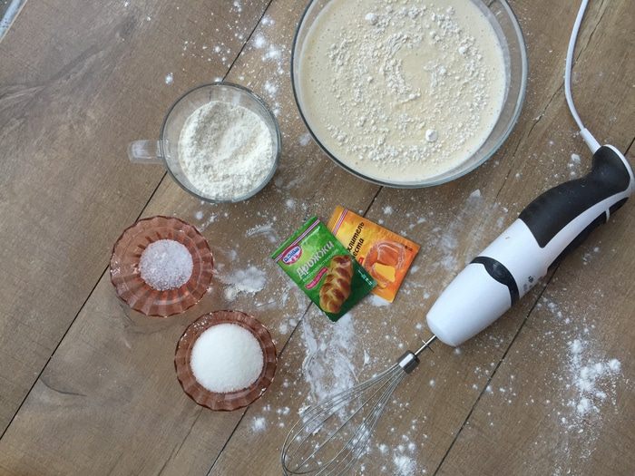 Добавляем муку, разрыхлитель, дрожжи, растительное масло, соль и сахар и перемешиваем вручную или венчиком блендера до однородной консистенции. Накрываем тесто полотенцем и оставляем в теплом месте на 30 минут.