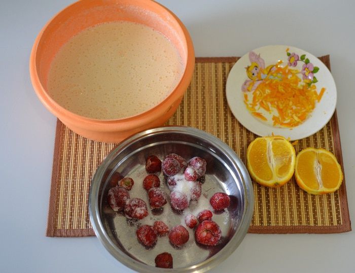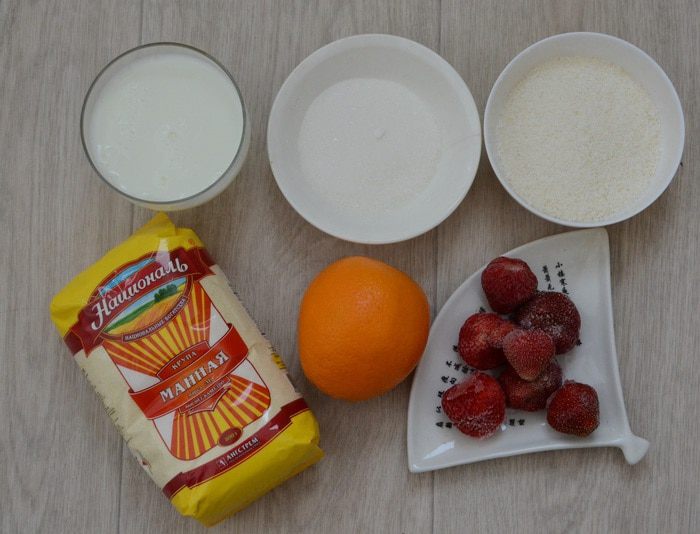 Для теста перемешиваем муку, манку ТМ «Националь», яйца, молоко, разрыхлитель, ванилин, сахар (по вкусу). Добавляем в тесто цедру апельсина и сок половины апельсина.