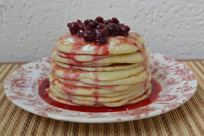 Каждый панкейк смазать сливочным маслом, полить вареньем из клубники\вишни (либо все вместе), украсить пудрой.