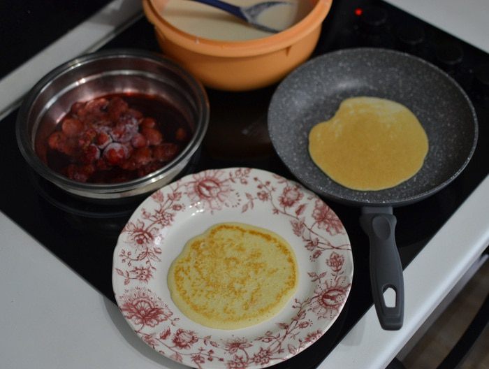 Выпекаем панкейки на сковороде с двух сторон, а тем временем варим клубнику с сахаром.