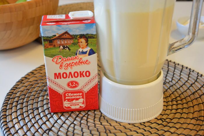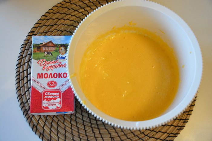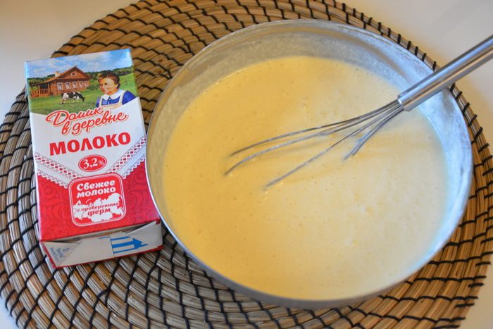 Добавить молоко «Домик в деревне» комнатной температуры и просеянную муку, взбить блендером, чтобы не было комочков.