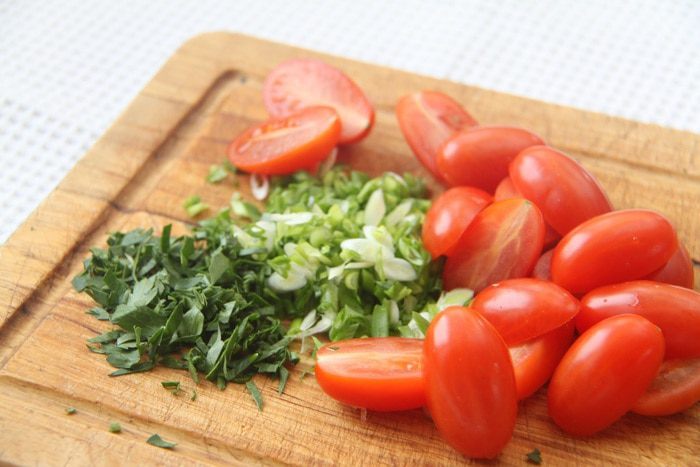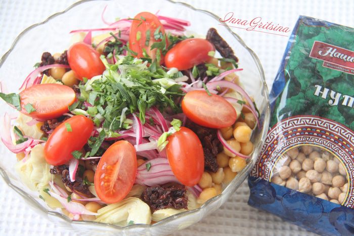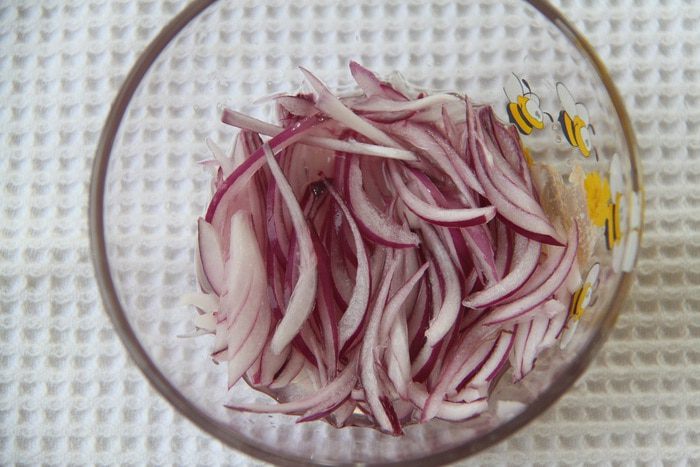 С лука слить маринад в отдельную миску. Добавить в салат маринованный лук, черри и зелень.