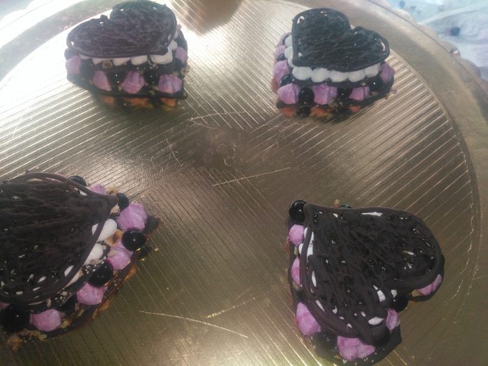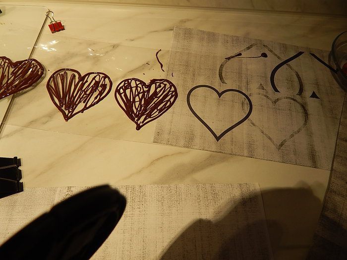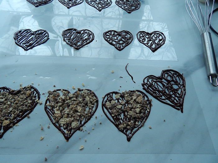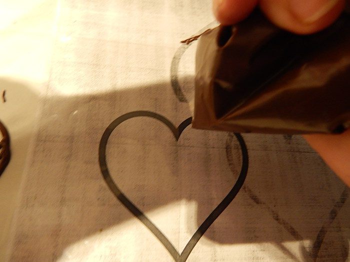 Растопленный шоколад переложить в кулинарный мешок или плотный пакет, или сделать кулек из пергамента. Кончик пакета срезать, так чтобы получалось отверстие 2 — 3 мм.