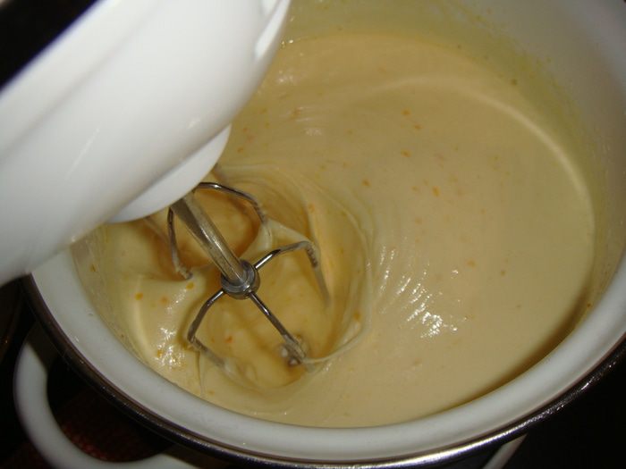 На водяной бане взбить 3 яйца и 3 желтка с 150 г сахара, пока сахар не растворится.