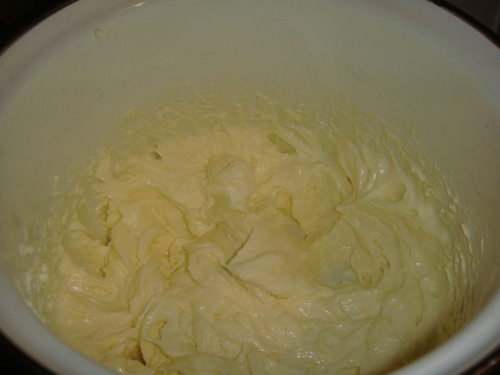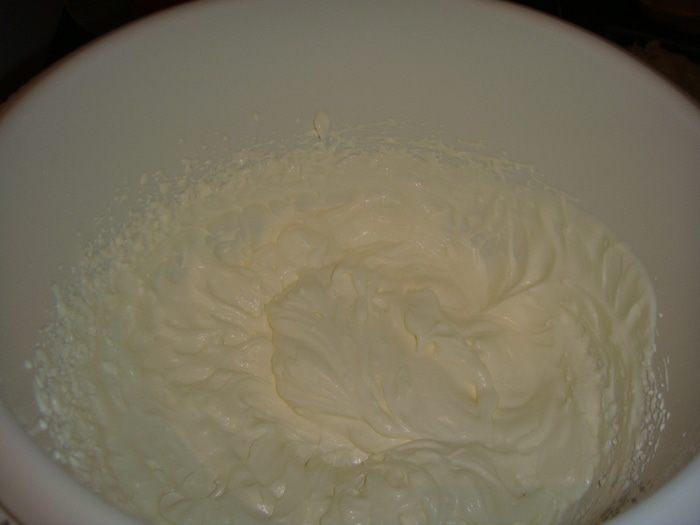 Для крема взбить охлажденные сливки в холодной посуде охлажденными венчикоми до устойчивых пиков.