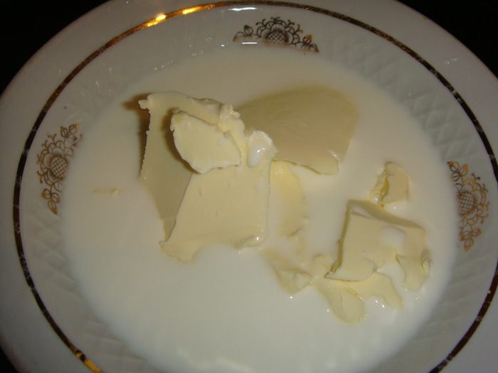 В миске соединить молоко и сливочное масло. Нагреть в микроволновке, пока масло не растает.