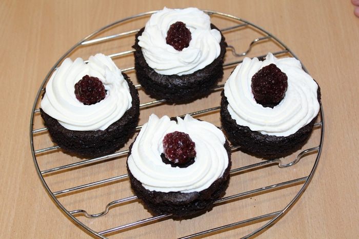 Собираем тортики. Крем перекладываем в кулинарный мешок. Отсаживаем крем по периметру, а в центр кладем свежие или размороженные ягодки (ежевика, вишня и т.д.).