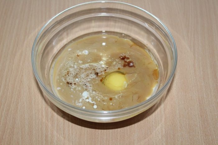 В отдельной чашке смешаем жидкие продукты, добавим яйцо, перемешаем.