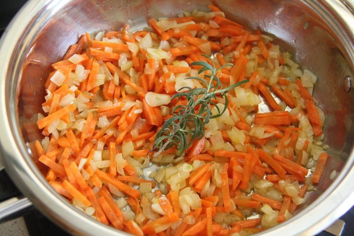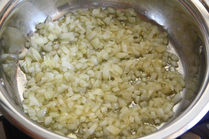 Лук порубить кубиком, обжарить на 3 ст. л. оливкового масла (минут 5).