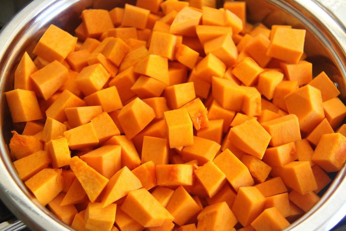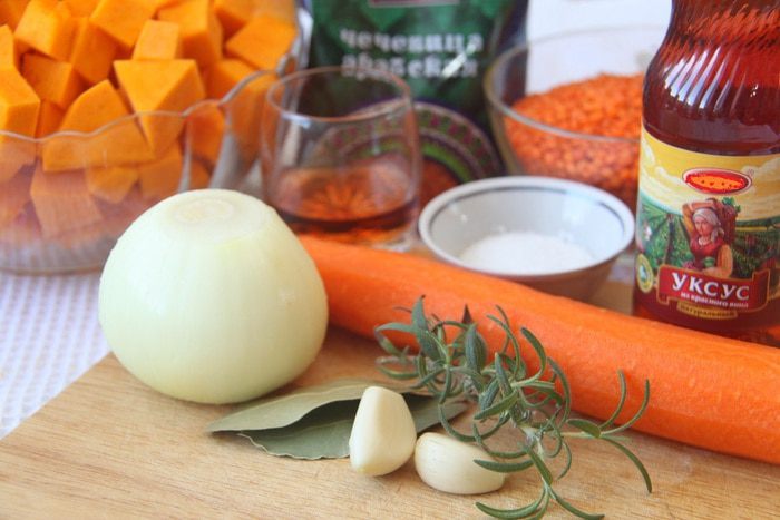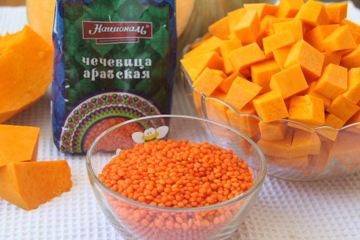 Тыкву очистить, нарезать небольшим кубиком, вес тыквы даю в очищенном виде 1 кг. Отмерить 200 г чечевицы.