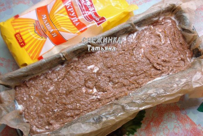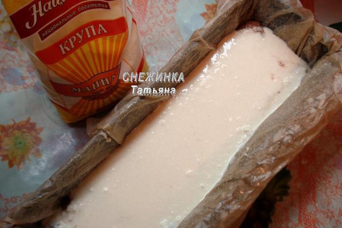 В форму кладем бумагу для выпечки, смазываем растительным маслом и присыпаем манкой. Можно взять любую форму — круглую, разъемную, у меня прямоугольная.
