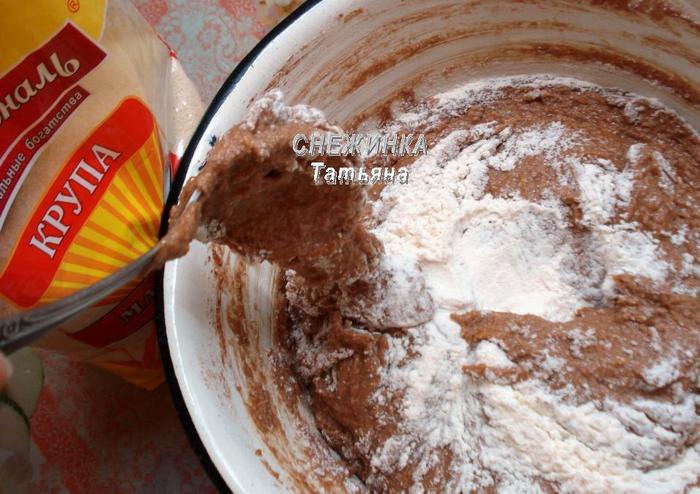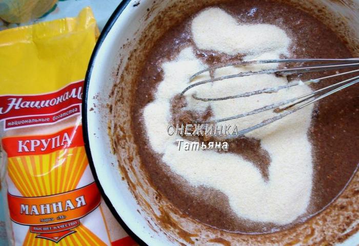 Добавляем какао-порошок, манную крупу ТМ «Националь», перемешиваем. Оставляем на 10 минут, чтобы манка немного разбухла.