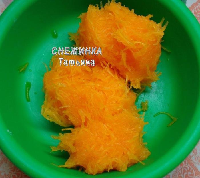 Натираем тыкву на терке, не крупной, но и не мелкой, так называемой сырной. Оставляем.