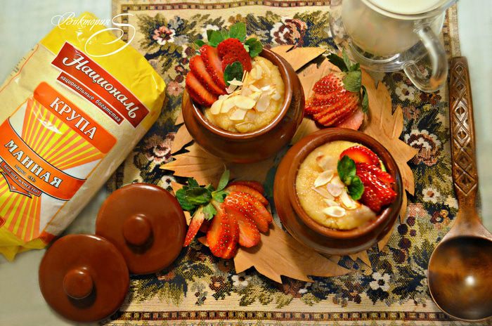 В сотейник налейте молоко и доведите до кипения. Энергично помешивая, всыпьте манную крупу ТМ «Националь», добавьте щепотку соли, сахар и ванильный сахар. Немного проварите. Каша должна получиться по густоте, как сметана средней густоты. Если получается слишком густой, то добавьте горячего молока.