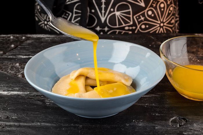 Отварить вареники в большом количестве подсоленной воды до готовности в течение 10 — 15 минут. Как только вареники всплывут, самое время их вынимать. Растопить сливочное масло «Домик в деревне» и полить вареники.