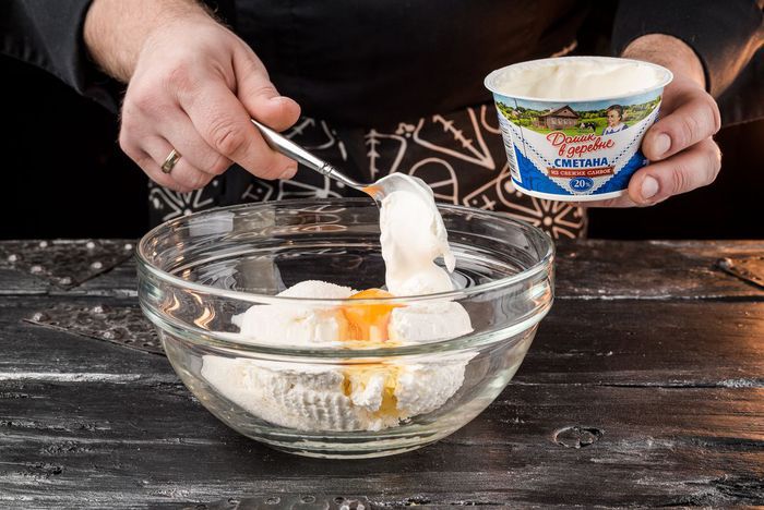 Приготовить начинку, соединив творог и сметану «Домик в деревне», яйцо, сахар и щепотку соли. Все тщательно растереть в однородную эластичную пасту.