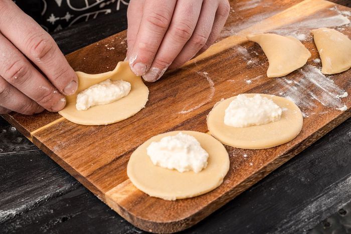 В центр каждого кружка положить начинку и защипнуть края. Шов должен быть не слишком плотным, но в то же время надежно удерживать начинку во время варки.