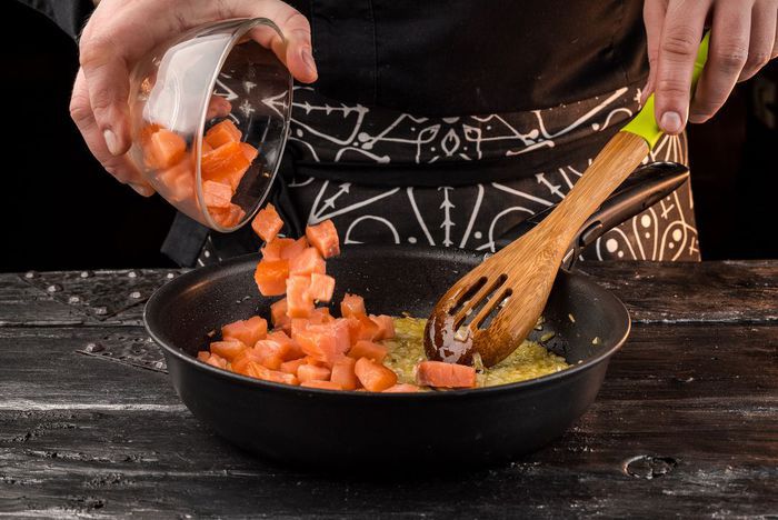 Рыбу нарезать небольшими кубиками (1 — 1,5 см), выложить в сковороду к луку и жарить пару минут на небольшом огне.
