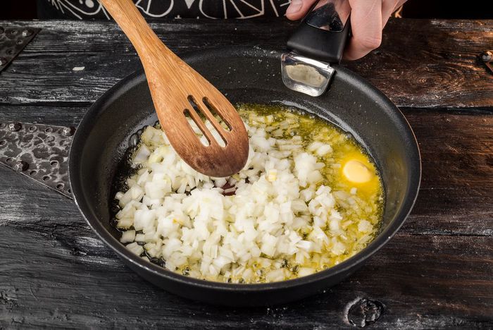 Духовку предварительно разогреть до 160°С. Лук почистить и мелко нарезать. Разогреть в сковороде сливочное масло «Домик в деревне» и слегка обжарить нарезанный лук.