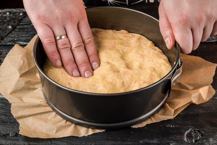 Смазать высокую форму для выпечки растительным маслом. Обмять подошедшее тесто и выложить в форму.