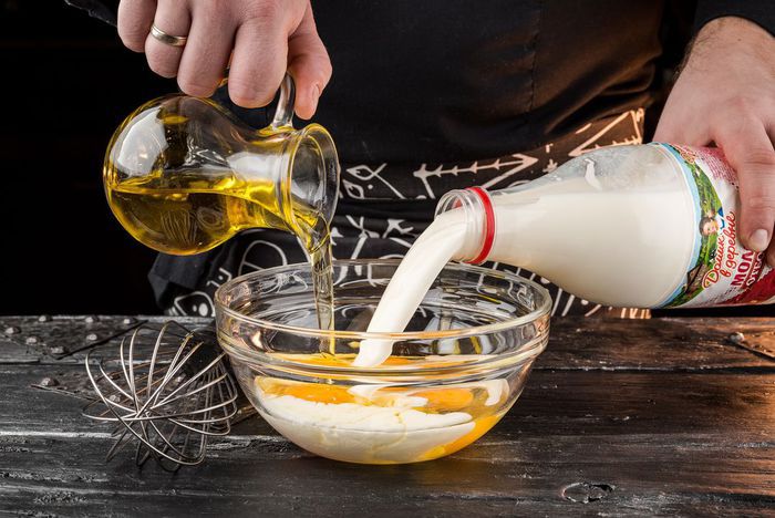 Яйца взбить со щепоткой соли. Добавить растительное масло и молоко «Домик в деревне». Все смешать.