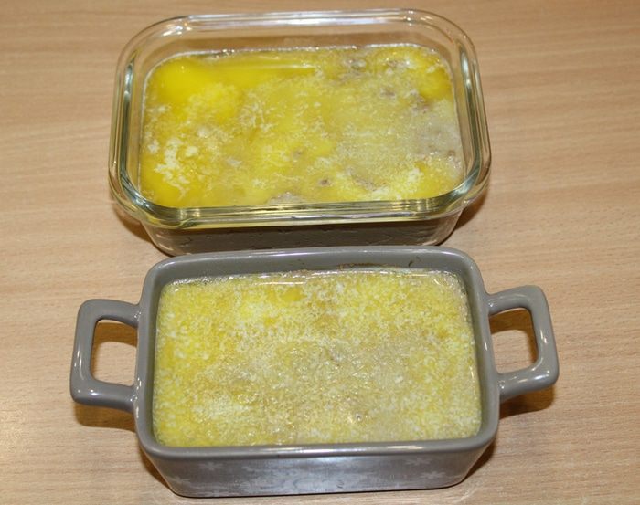 Полученную массу переложить в формочки, залить растопленным сливочным маслом.