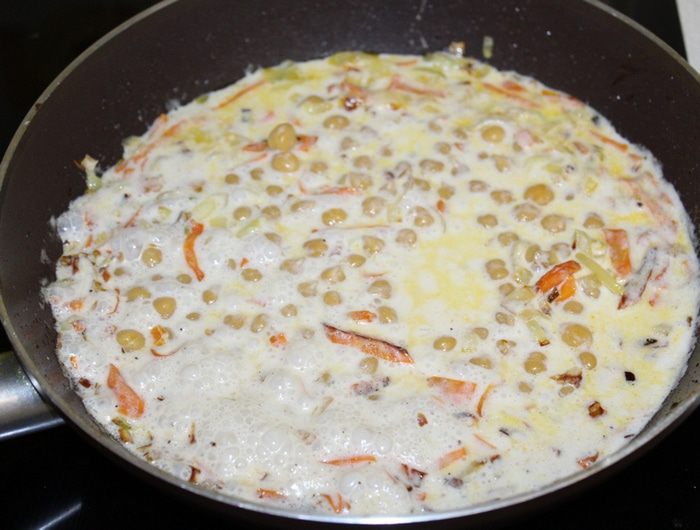 Обжарить лук, чеснок, морковь, влить сливки и потушить на небольшом огне пару минут.