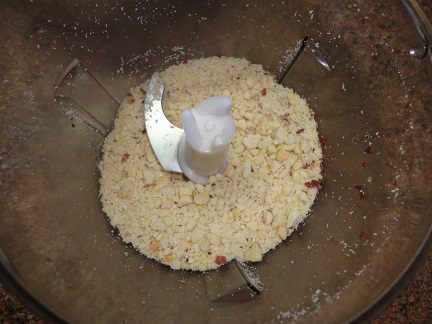Арахис подсушить на сухой сковороде, чтобы кожица легко отшелушивалась, и измельчить.