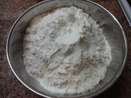 Соединить сухие составляющие рецепта: муку, разрыхлитель и крахмал.