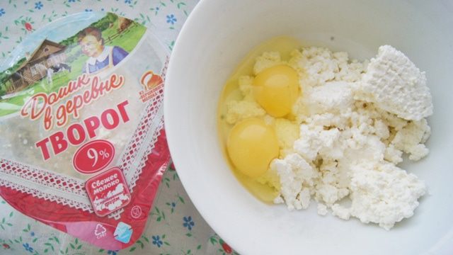 Смешать творог «Домик в деревне» и яйца, тщательно размягчить вилкой.