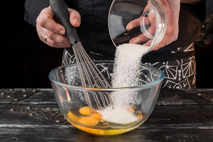 Разморозить вишни, слить воду и обсушить ягоды. Растопить сливочное масло «Домик в деревне», приготовить муку. От общего количества сахара отделить 1 ст. л., остальной сахар взбить с 4 яйцами.