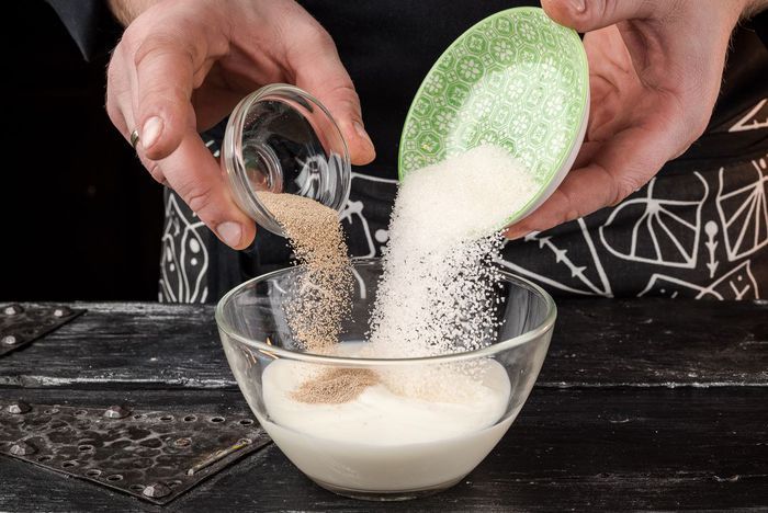 Готовим опару. Смешиваем дрожжи с теплым молоком и сахаром.