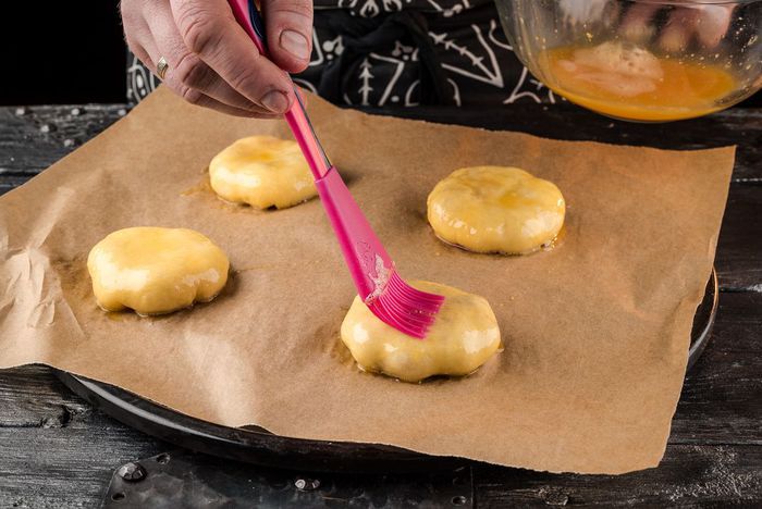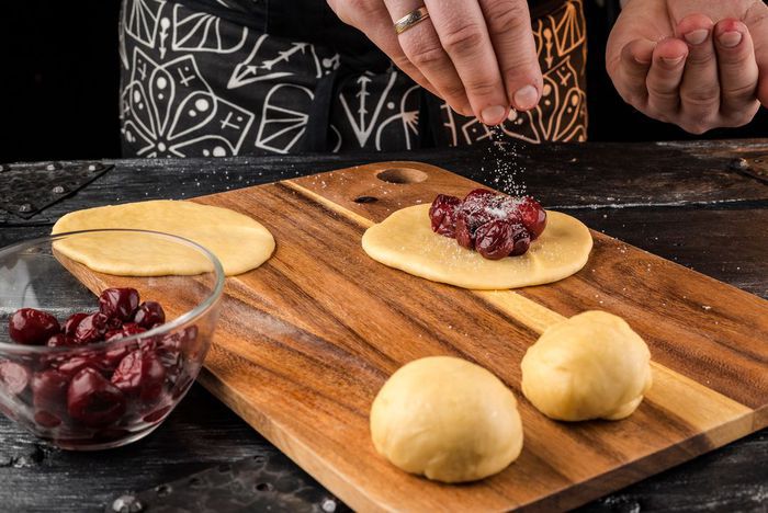 Готовое тесто разделить на кусочки и сформировать пирожки с вишнями. При желании можно добавить немного сахара.